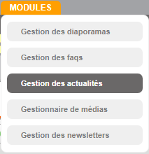 La zone de droite affiche par défaut un formulaire de saisie d'une nouvelle actualité. Plus d'informations à ce sujet en cliquant ici.