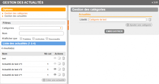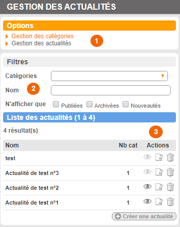 Boite options 1) Créer une actualité, gérer les catégories. Vous permet d'ajouter une nouvelle actualité ou de modifier / supprimer une catégorie. Boite filtres 2) Les filtres vous permettent de choisir quelles acutalités sont affichées dans la liste en dessous selon plusieurs critères : catégories, rubriques, nom, leur état (publiées, archivées, nouveautés). Boite Liste des actualités Cette boite liste toutes les actualités, sauf si vous avez mis des filtres en (2). 3) Actions, vous pouvez à l'aide de ces boutons : publier ou dépublier une actualité modifier une actualité supprimer une actualité.Si vous desirez publier ou dépublier une actualité, cliquez sur le bouton de publication. |