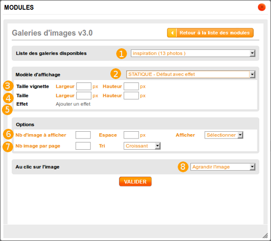 - Liste des galeries disponibles : choisir la gallerie que l'on veut afficher sur la page.