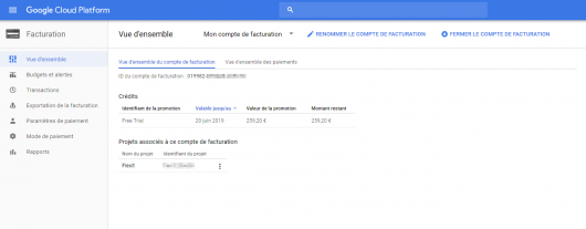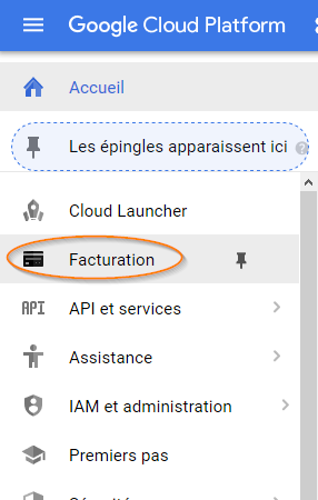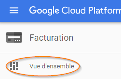 Accéder à l'adresse https://console.cloud.google.com et connectez vous si vous ne l'êtes plus.En utilisant le menu en haut à gauche dans la barre bleue supérieure ( les trois traits blancs ), sélectionnez Facturation.