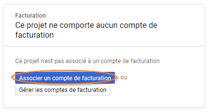 Vous n'avez normalement aucun compte de facturation et devriez voir apparaitre la boite ci-dessous. Cliquez sur associer un compte de facturation.