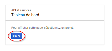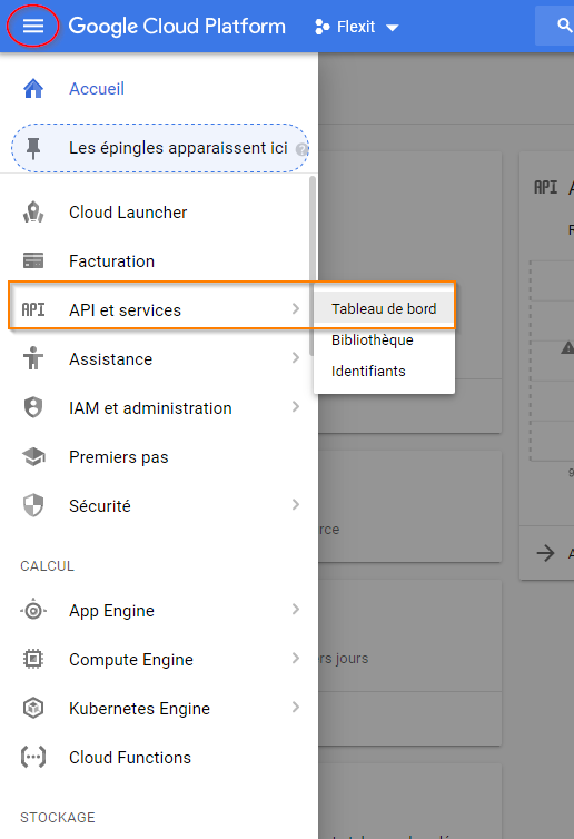 Lorsque le projet sera créé, cliquez sur le bouton de menu en haut à gauche dans la barre bleue puis choisissez API et services > Tableau de bord