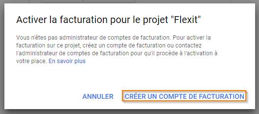 Une fenêtre vous informant qu'aucun compte de facturation existe va s'afficher. Choisissez créer un compte de facturation. Par défaut il sélectionnera votre projet actif. Comme pour les étapes précédentes ce nom sera celui que vous avez choisi pour votre projet. Dans notre exemple nous utilisons toujours Flexit.