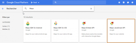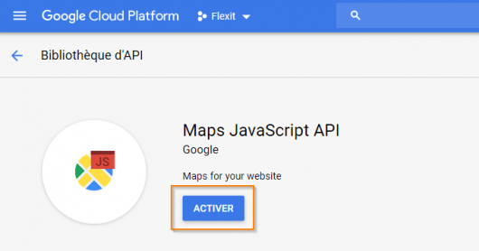 Commencez par activer la première API nécessaire : Maps JavaScript API en cliquant sur le petit pavé ayant cet intitulé.