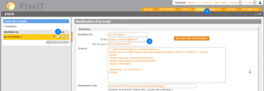 Afin de récupérer les informations de connexion, connectez vous à Flexit. Puis une fois connecté à Flexit, cliquez sur l'onglet Stats. Dans la colonne de gauche, cliquez sur le bouton Modifier de votre identifiant. Une fois chargé, vous verrez apparaitre l'adresse email et le mot de passe nécessaire à la connexion à Google.