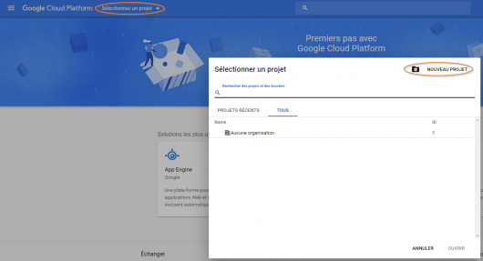 Accéder à l'adresse https://console.cloud.google.com et connectez vous si vous ne l'êtes pas déjà.Si vous n'avez pas de projet existant ou que vous avez un projet sélectionné par défaut cliquez sur le nom du projet dans la barre bleue au dessus et dans la fenêtre de sélection du projet, vous aurez un bouton Nouveau projet en haut à droite.
