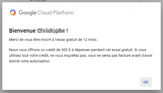 Lorsque vous aurez cliquez sur le bouton vous devez avoir une fenêtre qui confirme la création de votre compte de facturation. Vous pouvez cliquer sur OK.