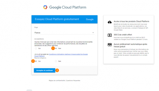 La procédure de création de compte est initialisée. Remplissez le formulaire. Les offres spéciales sont facultatives / enquêtes de satisfaction sont facultatives, par défaut nous ne les activons pas mais si vous êtes intéressés par les offres de Google vous pouvez tout à fait choisir de mettre oui. Une fois vos options choisies, cliquez sur accepter et continuer.