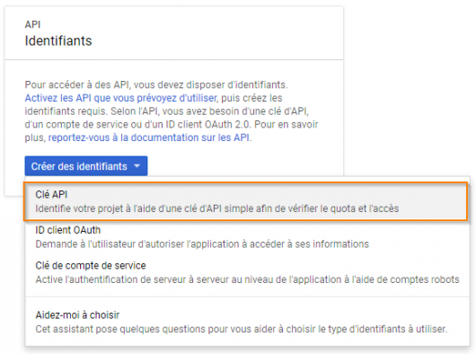 Maintenant que toutes nos APIs sont activées, nous allons créer la clef. Cliquez sur le bouton de menu et choisissez API et services > Identifiants.