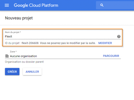 Vous allez arriver à la configuration de votre projet. Spécifiez le nom de projet que vous désirez. L'organisation est facultative.