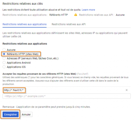 La configuration la plus simple est de choisir des Référents HTTP (ou sites web). Cochez Référents HTTP, puis saisissez votre l'adresse de votre site sous ce format :