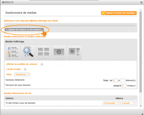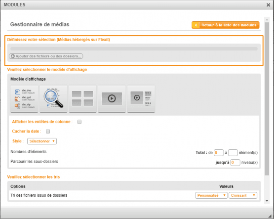 La zone "Définissez votre sélection" est la première zone du paramétrage du module gestionnaire de média (pour voir comment poser le module gestionnaire de médias dans le contenu cliquer ici)