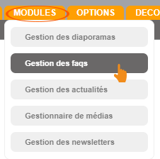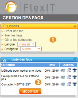 Boite options (1) Créer une faq, vous permet d'ajouter une nouvelle question. Trier les faqs, vous permet d'ordonner chaque question. Gérer les catégories, vous permet d'ajouter, modifier ou supprimer une catégorie. Langue, vous permet de changer de langue et de visualiser les questions existantes dans une langue choisie. Catégorie, vous permet d'afficher dans la boite Listes des faqs les questions de la catégorie choisie. Boite Liste des faqs (2) Cette boite liste les faqs en affichant leur nom et leur date. Actions, vous pouvez à l'aide de ces boutons, publier |