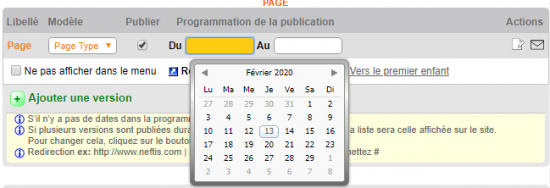 - Ajouter une version : permet de travailler sur une autre version de la page sans affecter la version publier (la version de base). Si plusieurs versions sont publiées, la plus haute de la liste sera prise en compte. Ne jamais dépublier la "version de base"