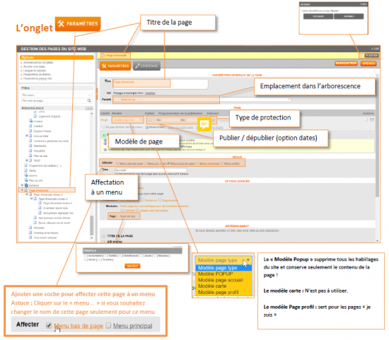 - Modèle de page utilisé : permet éventuellement d'en changer (attention à la perte éventuelle de contenu pour une page existante)