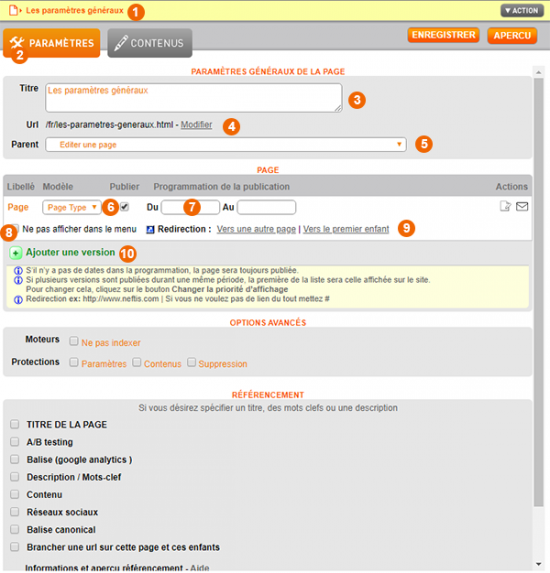 - Référencement avancé (pour modifier la réécriture d'URL et affecter des mots-clés spécifiques à cette page)