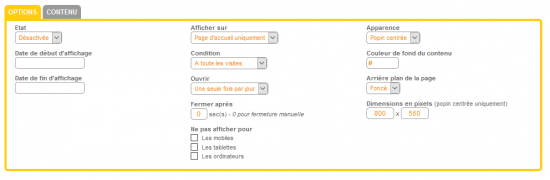 - Si vous mettez une date de début d'affichage et pas de date de fin, la popup s'affichera indéfiniment à partir de cette date.